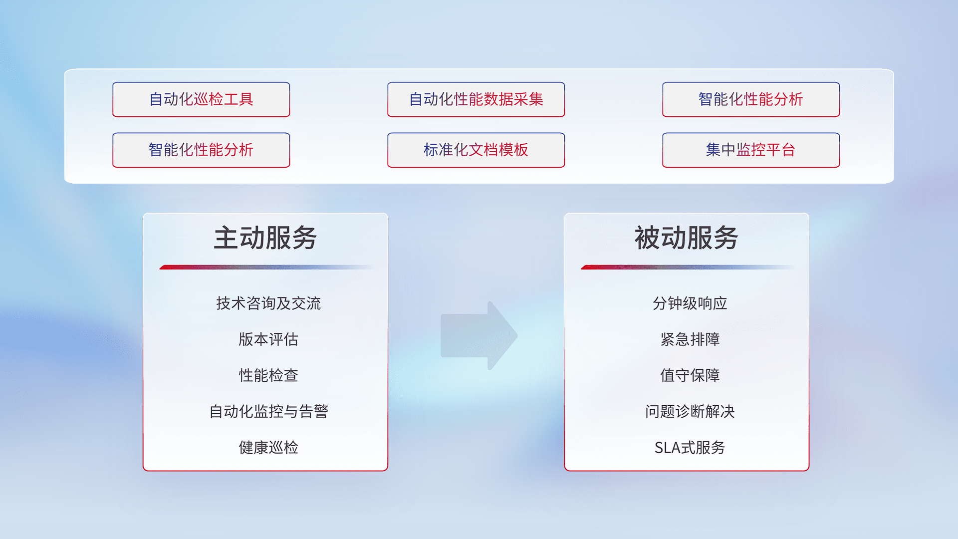 智能化工具和标准化文档,,,,保障服务质量,,,提供主动服务(包含技术咨询、、版本评估、、性能检查、、自动化监控与告警、、、健康巡检)和被动服务包含(分钟级响应、、紧急排障、、值守保障、、、问题诊断解决、、SLA服务)。。。